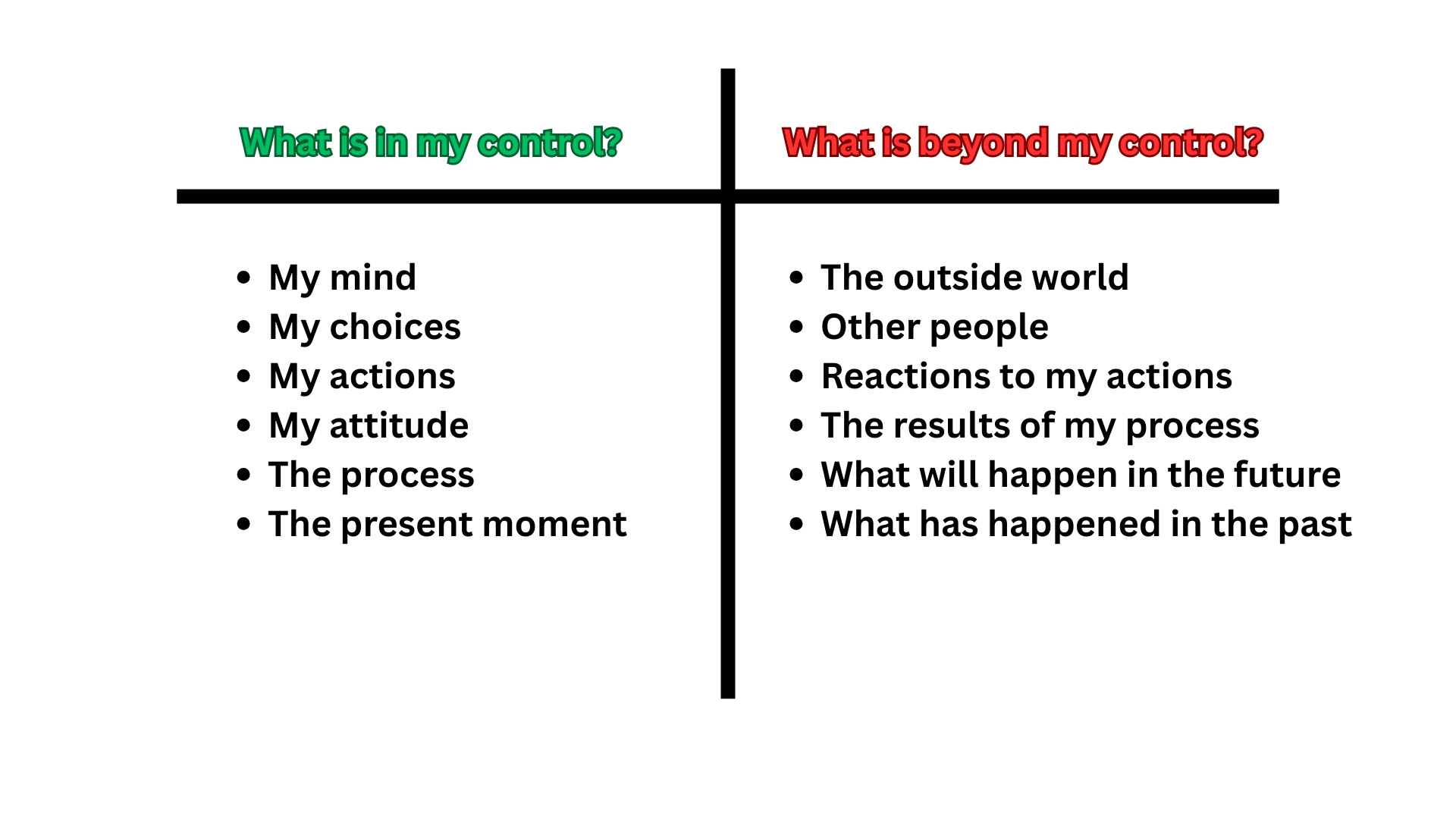 For everything —especially the things you fear or resist the most—make a list of what is in your control and a list of what isn’t. In reality, you control very little, yet your suffering thrives on thinking about things beyond your control.